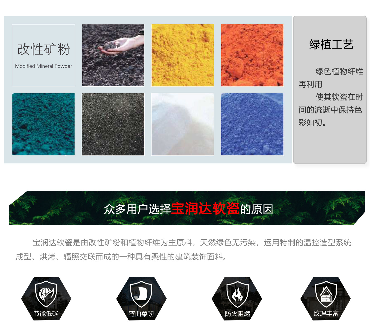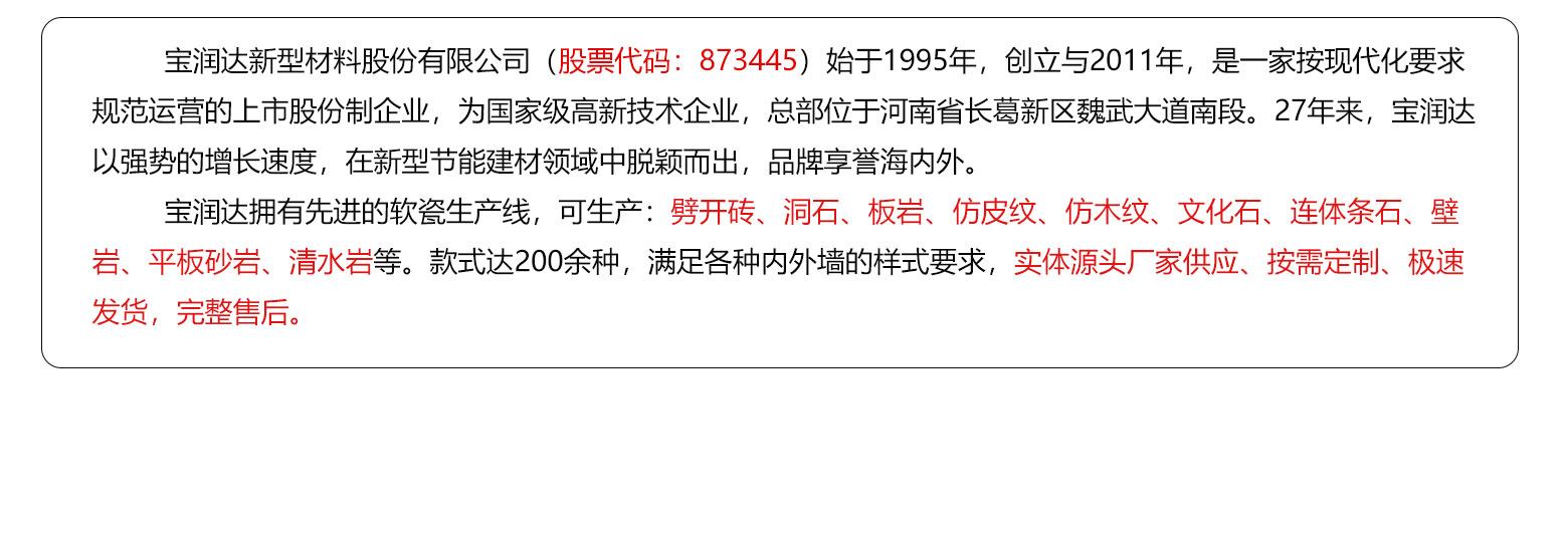 寶潤達外墻軟瓷磚:具有安全環(huán)保、抗震防裂、耐火防凍、拒水透氣、耐酸耐堿等優(yōu)良特性,表現(xiàn)力豐富,是良好的室內(nèi)外建筑飾面材料